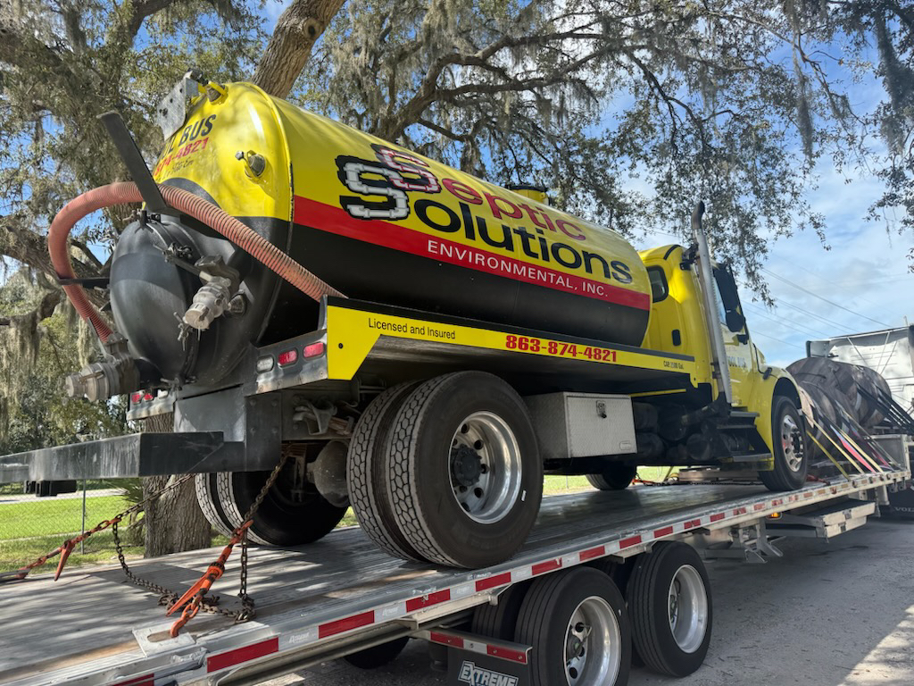 Professional septic truck transport — safely hauling vacuum, pump, and service trucks with specialized trailers, insurance, and expert logistics.